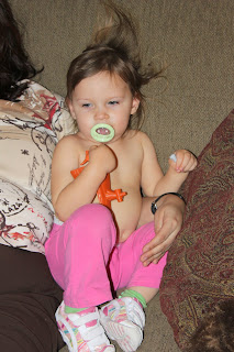 Lily and I chilling and watching TV on Friday. My silly girl didn’t mind wearing shoes but insisted on taking her shirt off. I love how the couch made her hair look like the twist on the top of a Dairy Queen ice cream cone: